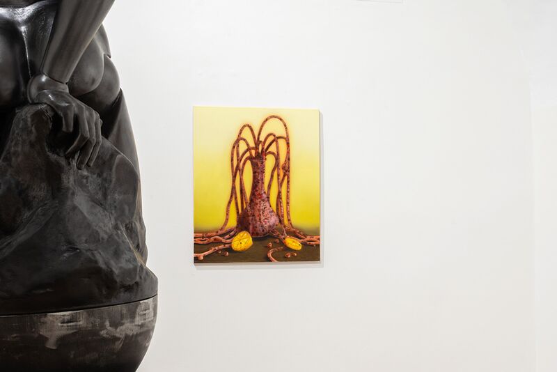 Im Vordergrund mögen, mit schillernden weißen Pinselstrichen, minimalistische Portraits den ersten Blick einfangen; mögen teils pastos aufgetragene (vielleicht gegenstandslose) Linien, Augen, Zähne, Hundeköpfe dominieren. Oder Schuhe, die wie zu einem Lauf in die Tiefe positioniert sind.